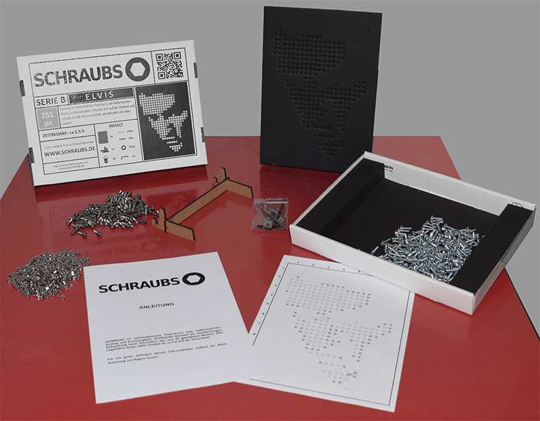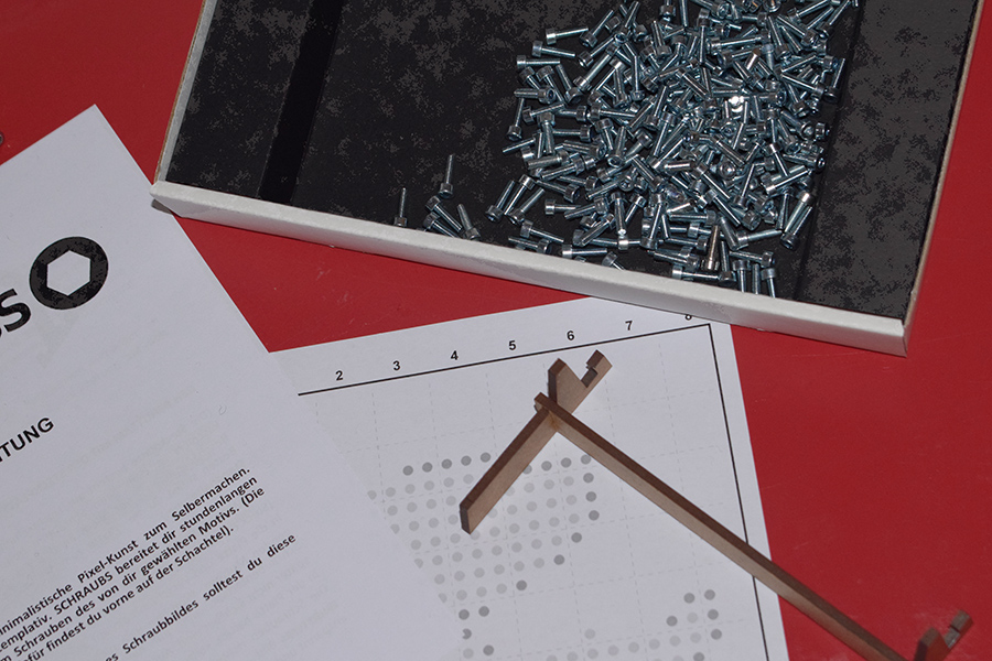 Ein SCHRAUBS-Set besteht aus der SCHRAUBS-Platte mit vorgestanztem Motiv, je 200-400 Schrauben in zwei verschiedenen Farben, der entsprechenden Menge an Muttern, einem Schraubenschlüssel sowie einer Standhalterung und Aufhängern zum späteren Befestigen an der Wand. Um ein Motiv fertigzustellen, benötigst du etwa 2 bis 4,5 Stunden.